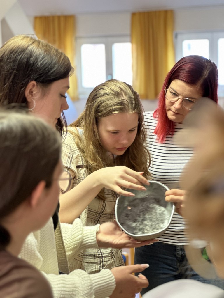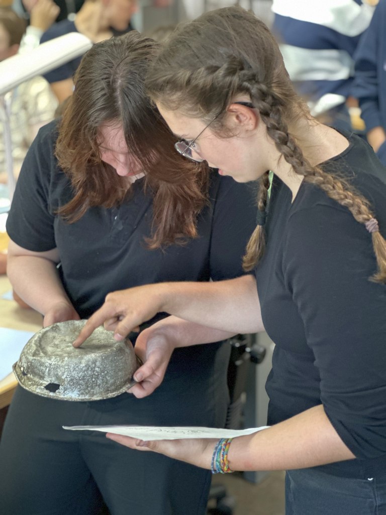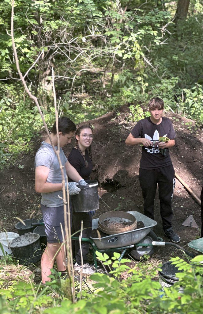 Die SS hatte so etwas wie eine „Müllhalde“. Dort haben sie den ganzen materiellen Müll hingeschmissen. Während der Zeit des Lagers lieferte die SS dort ihren Müll ab und nach der Zeit der Befreiung (also nach 1945), haben die Amerikaner ebenfalls „aufgeräumt“. An diesem Ort wurde sehr viel gefunden: Ganz viel Geschirr, Glas, Steinziegel und Leder (z.B. Schuhe oder selbstgemachte Stücke der Gefangenen). Wir hatten die Möglichkeit, mit einer kleinen Gruppe dort eine Ausgrabung zu machen – zum ersten mal nach drei Jahren, weil durch die Coronazeit dort niemand war. Das bedeutet, wir mussten erst ein bisschen Unkraut entfernen, damit wir überhaupt anfangen konnten. Wir als Gruppe fanden sehr viel; vieles davon sortieren wir noch vor Ort und legten es auf den entsprechenden Müllberg. Wir hatten einen Glasberg, einen Lederberg, einen Keramikberg und einen Berg, auf den Blumentöpfe und ähnliches gelegt wurden. Gegenstände mit Schriften, Zahlen, oder Markierungen haben wir mit nach oben in die Restaurationswerkstatt gebracht. An dieser Stelle möchten wir uns bei Ronald Hirte und Sophia bedanken, dass die beiden sich so viel Mühe gemacht haben, uns vor Ort zu betreuen und dass wir dort so viel machen durften. (www.stiftung-gedenkstaetten.de/team-kontakt/ronald-hirte)