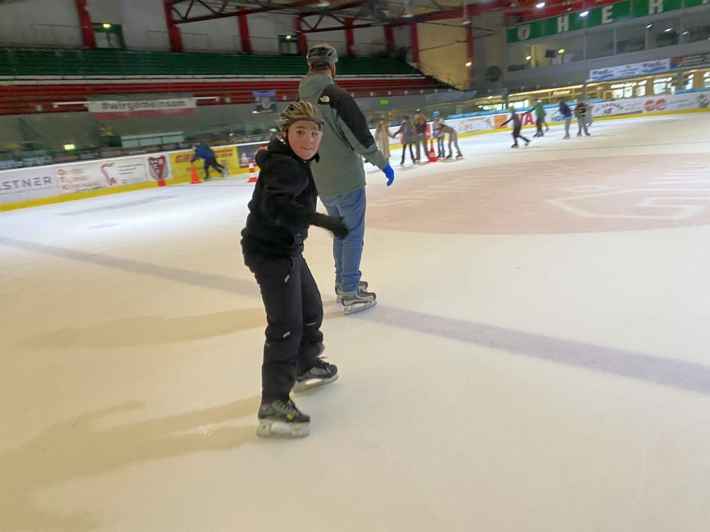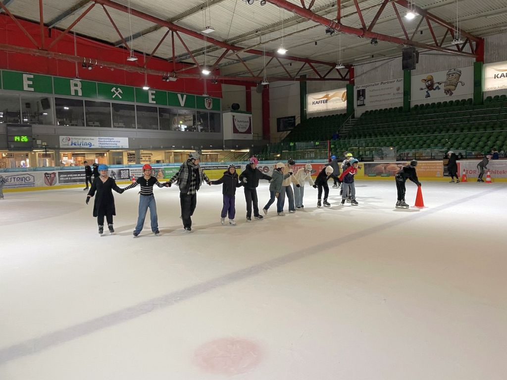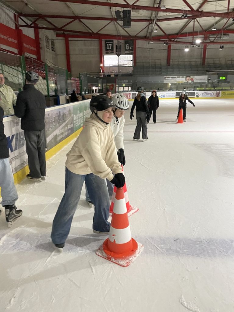 Schon beim Betreten der Halle war bei einigen die Vorfreude spürbar, bei anderen überwiegten die Unsicherheiten, da sie sich erstmals aufs Eis wagten. Nach den ersten vorsichtigen Schritten auf dem Eis legten viele ihre anfänglichen Ängste ab. Mit strahlenden Gesichtern probierten die Schülerinnen und Schüler verschiedene Techniken aus, verbesserten ihre Körperspannung und trainierten ihr Gleichgewicht. Während einige bereits elegant über das Eis glitten, wagten sich andere tapfer an ihre ersten Gleitversuche – stets unterstützt von ihren Mitschülerinnen und Mitschülern. Besonders schön war die gegenseitige Hilfsbereitschaft: Stürze wurden mit einem Lächeln weggesteckt, helfende Hände waren immer zur Stelle.