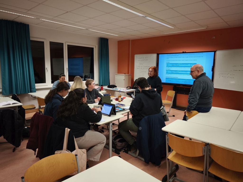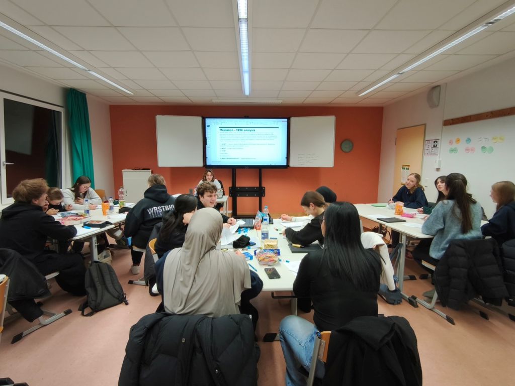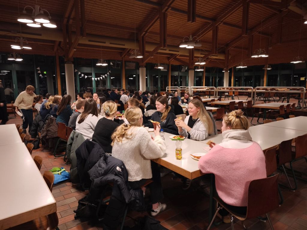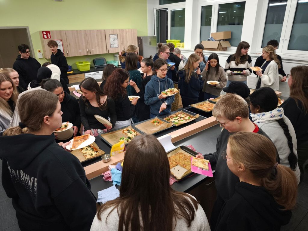 Wahrscheinlich kann man sich etwas Schöneres vorstellen, als den Beginn des Wochenendes abends in der Schule zu verbringen. Nicht so jedoch 45 Schüler*innen unserer Q2, die sich am 6.2. in der Zeit von 18.00 bis 22.00 Uhr in den neuen Oberstufenräumen unserer Schule einfanden, um sich gezielt auf die Aufgabenformate im Abitur mit konkreten Übungsaufgaben und direktem Lehrerfeedback vorzubereiten. Nach einer kurzen Begrüßung konnten die Schüler*innen in zwei Arbeitsphasen in den Fächern Deutsch, Mathe und Englisch ihre Kompetenzen erweitern und Sicherheit für die anstehenden Vorabitur- und Abiturklausuren sammeln. Unterstützt wurden sie dabei von sechs Kolleg*innen sowie sieben Schüler*innen der Jahrgangsstufe 10, die, unter tatkräftiger Unterstützung von Frau Baron und Frau Hoffmann, in einer Arbeitspause die Schüler*innen der Q2 mit selbstgebackener Pizza versorgten.