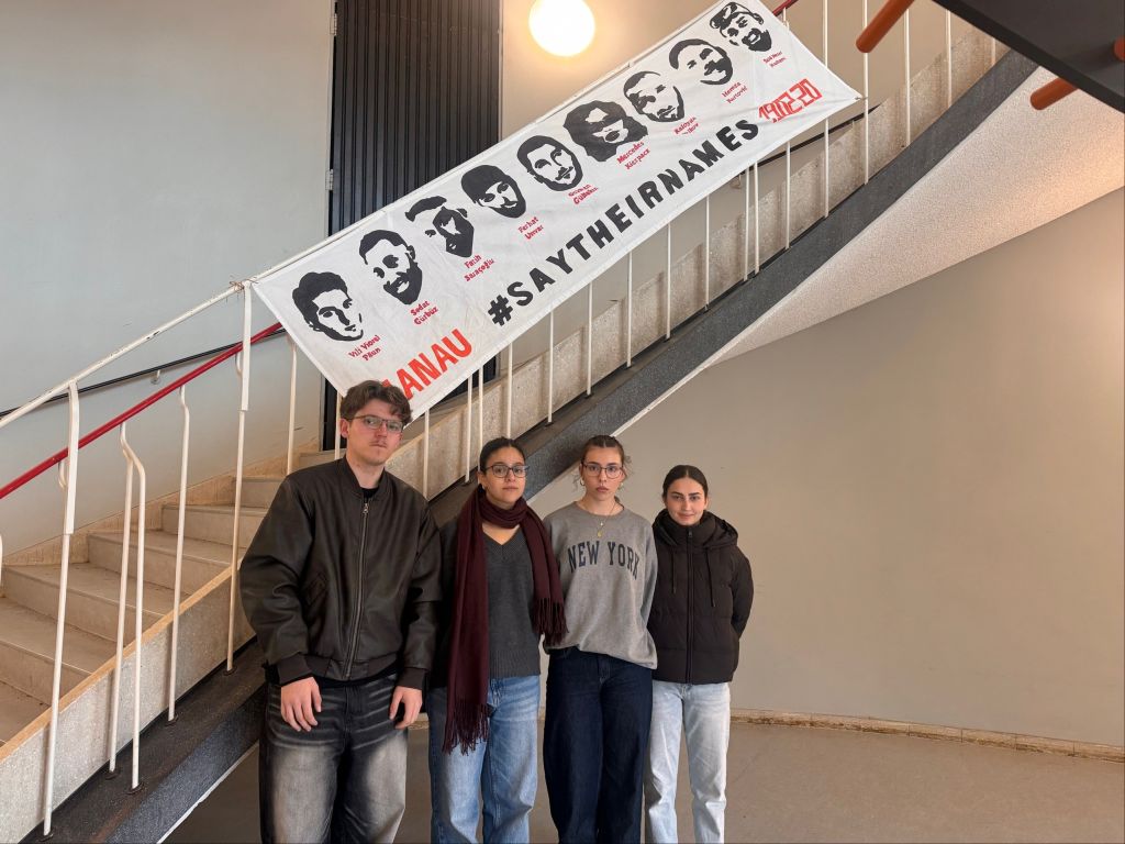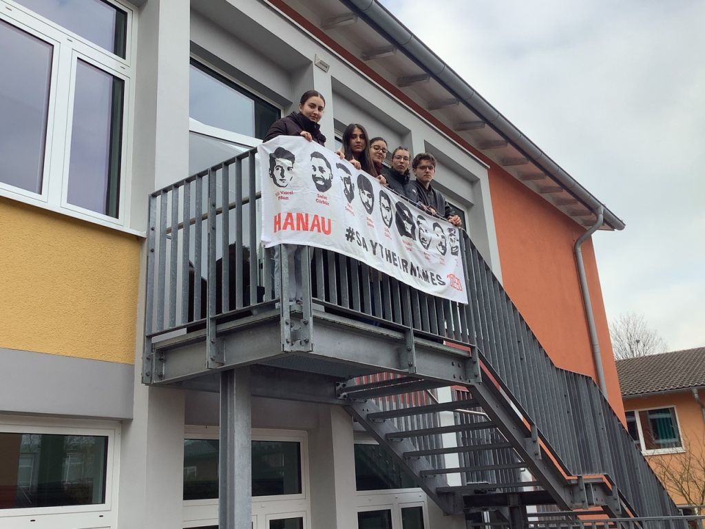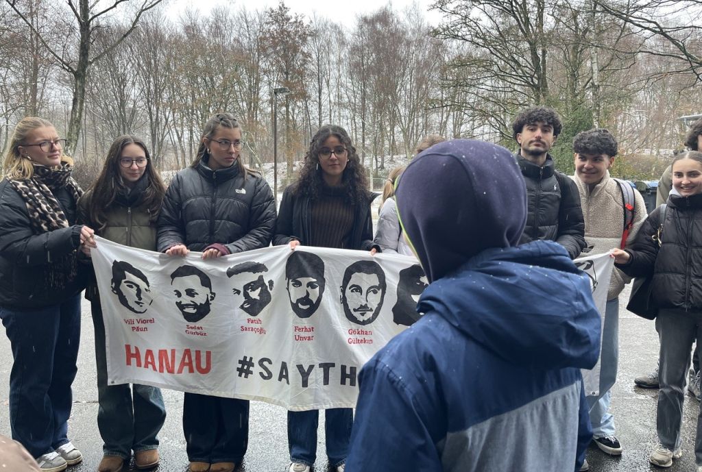 Ganz im Zeichen des Gedenkens an die Ermordeten von Hanau stand wieder der 19. Februar. Unser Projektkurs "Schule ohne Rassismus" hing unser Erinnerungs-Banner gut sichtbar in der Schule auf, veranstaltete in den Pausen Mahnwachen auf unseren Schulhöfen und klärte vor allem jüngere SchülerInnen* auf, die oftmals noch nichts von Fatih, Vili, Sedat, Mercedes, Hamza, Gökhan, Kaloyan, Ferhat und Said Nesar gehört hatten. Traurigerweise ist vor wenigen Wochen noch Ibrahim Akkus dazu gekommen, der an den Spätfolgen des Anschlags gestorben ist.