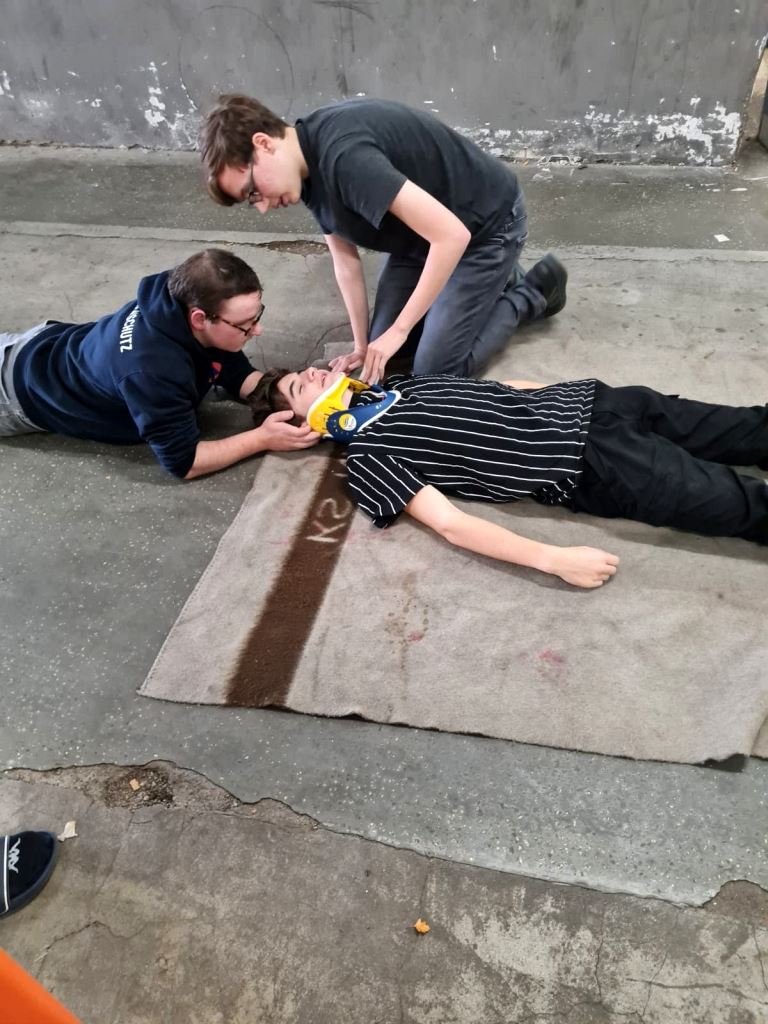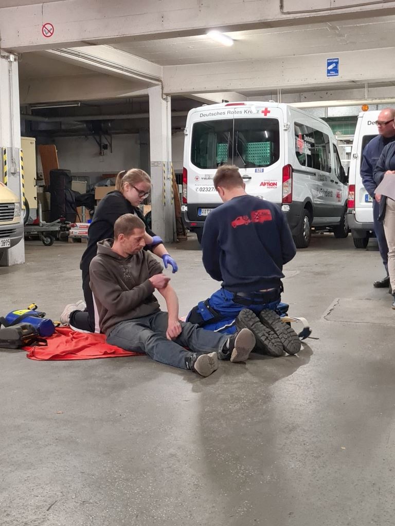 Die Schüler*Innen Lisa, Florian, Nico und Fynn aus der Schulsanitätsdienst AG ließen sich in einem 60-stündigen Lehrgang zu richtigen Sanitätern ausbilden. Über zwei Monate lang führte sie ihr Weg jedes Wochenende nach Bochum-Wattenscheid zum DRK-Kreisverband. Hier lernten und übten sie zum Beispiel das Durchführen von lebensrettenden Sofortmaßnahmen sowie das Versorgen von bedrohlichen Blutungen.