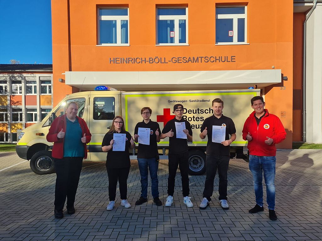 Aber auch das Zusammenarbeiten mit dem Rettungsdienst und Notarzt, das Erkennen und Maßnahmen bei akuten Erkrankungen sowie Rettungs- und Transporttechniken wurden eingeübt. Nach der erfolgreichen Abschlussprüfung erhielten die vier Schülerinnen und Schüler ihre Sanitäter-Bescheinigung von dem Vorsitzenden des DRK-Kreisverbundes. Es wurde ein besonderes Lob ausgesprochen, da Lisa, Fynn, Nico und Florian in ihren Prüfungen sehr beeindruckt hatten. Die Schulleitung sowie die gesamte Schulsanitätsdienst AG waren bei der Urkundenübergabe anwesend und gratulierten herzlich.
