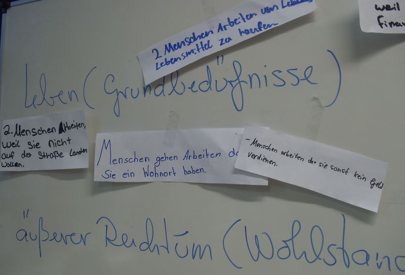 Wir waren ehrlich überrascht von den Antworten der Kinder. Natürlich geht es um die Sicherung von Grundbedürfnissen und Lebensverhältnissen; natürlich geht es um Geld und auch um Anerkennung. Was uns wirklich überrascht hat war, dass viele Kinder eben nicht in Geld und Anerkennung einen Grund für sich beschrieben, sondern in so etwas wie Sinn, Wertschätzung, ja Spaß und eben keine Langeweile. Vielleicht ist der Mensch ja wirklich als soziales Wesen zu Arbeit gezwungen, weil er ohne diesen Zwang gar nicht wüsste, wie er sich als soziales Wesen erfahren und begreifen sollte.