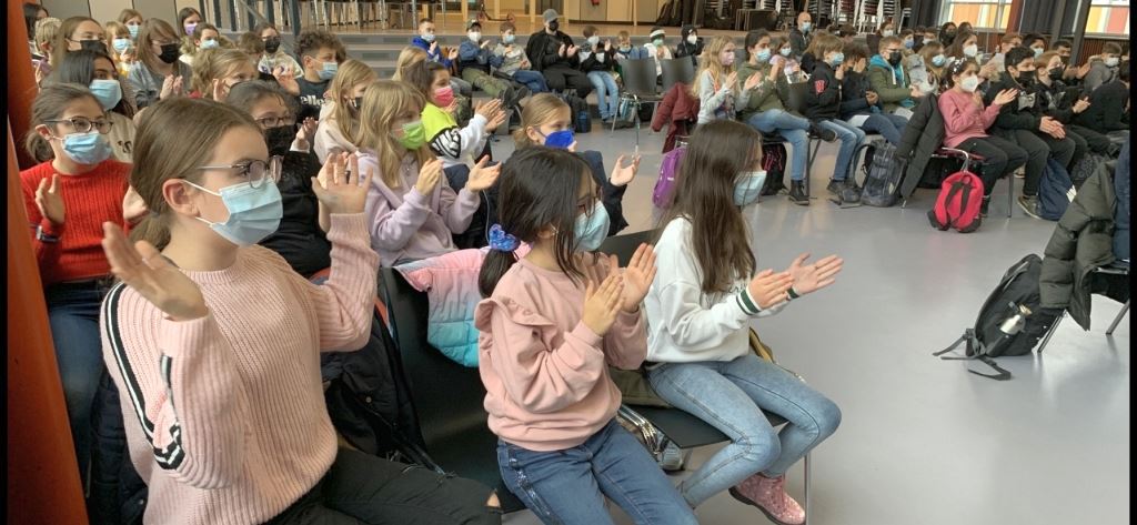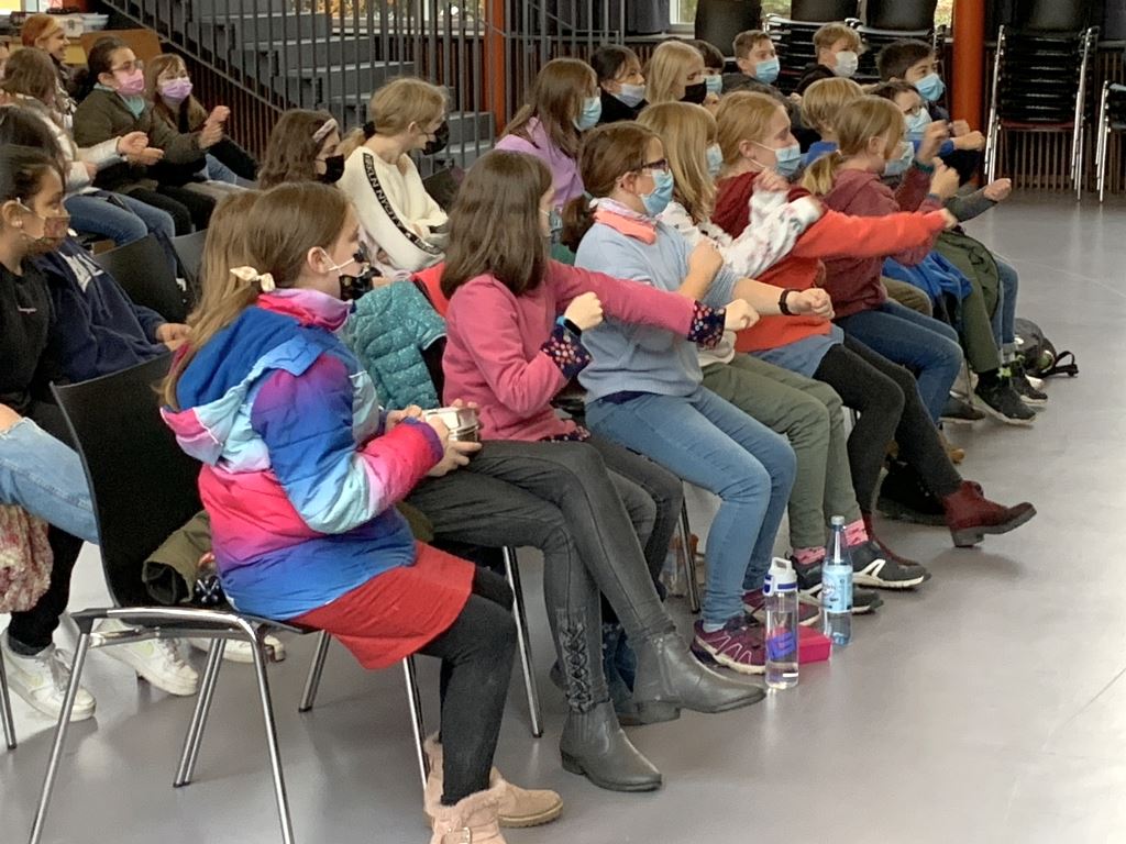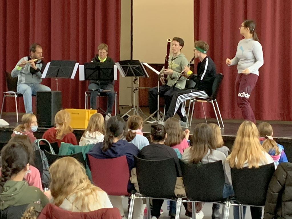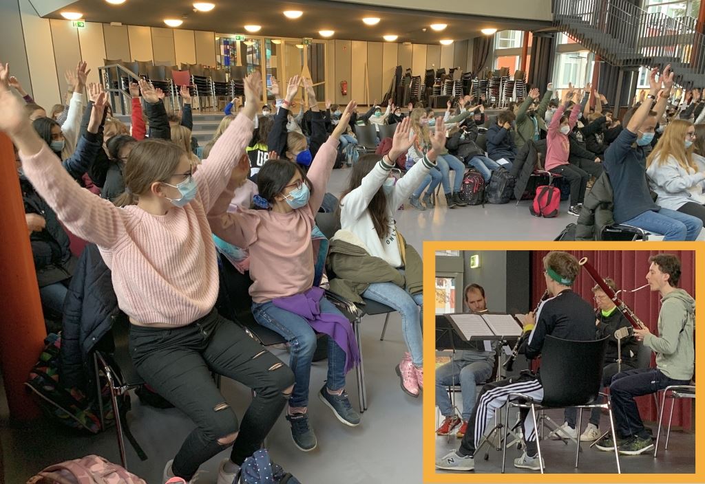 Schüler*innen der Jahrgangsstufen 5 und 6 konnten Musik für Holzblasinstrumente lauschen, den Klang der einzelnen Instrumente kennenlernen, aber auch mitklatschen oder stampfen und durch den Applausometer den jeweiligen Sieger küren.