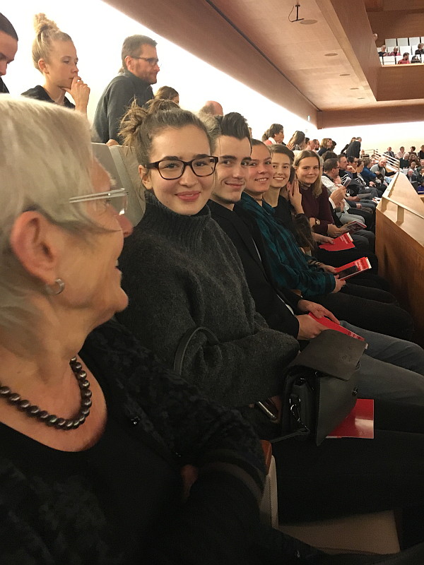 Schon in der Pause: Begeisterung. Die Musik war in aller Munde und an jedem Tisch wurde fleißig die Vielfalt der Musik analysiert und diskutiert. Am Ende verließen alle nahezu euphorisch und beschwingt den Konzertsaal. Als kleine Erinnerung an den schönen Abend, gelang es uns dann auch noch, ein Gruppenbild mit dem Konzertmeister der BoSy zu ergattern, ein rundweg gelungener Abend und ein wunderbarer Abschluss des Projektes „Gemeinsam ins Konzert“!