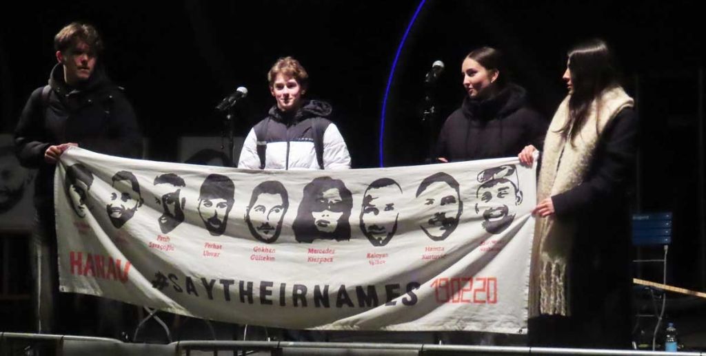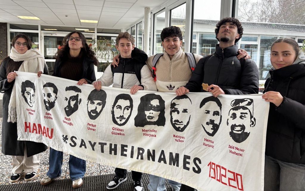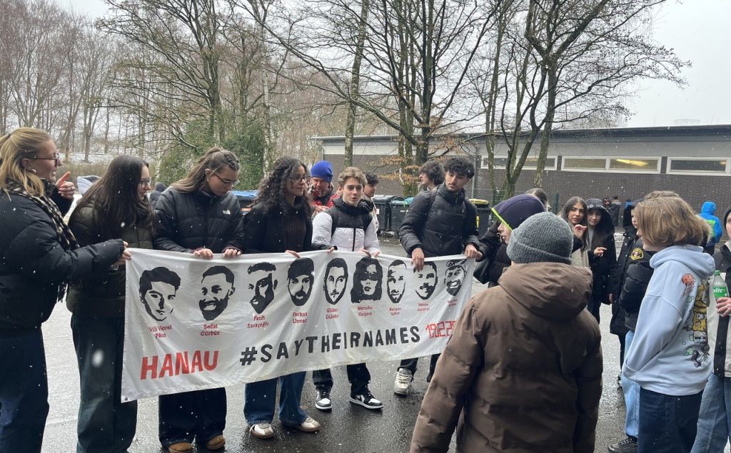 Ganz im Zeichen des Gedenkens an die Ermordeten von Hanau stand wieder der 19. Februar. Unser Projektkurs "Schule ohne Rassismus" hing unser Erinnerungs-Banner gut sichtbar in der Schule auf, veranstaltete in den Pausen Mahnwachen auf unseren Schulhöfen und klärte vor allem jüngere SchülerInnen* auf, die oftmals noch nichts von Fatih, Vili, Sedat, Mercedes, Hamza, Gökhan, Kaloyan, Ferhat und Said Nesar gehört hatten. Traurigerweise ist vor wenigen Wochen noch Ibrahim Akkus dazu gekommen, der an den Spätfolgen des Anschlags gestorben ist.