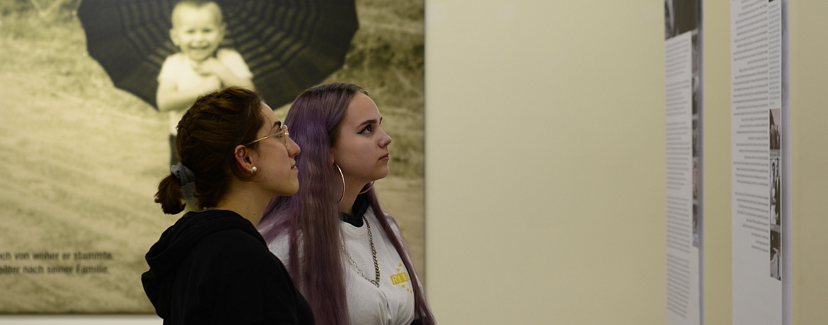 In der Wechselausstellung waren Fotos und Biographien ehemaliger KZ-Häftlinge ausgebreitet – fotografiert zumeist im hohen Alter und kaum erkennbar als junge, sehr junge Gefangene und Kinder in und von Auschwitz.