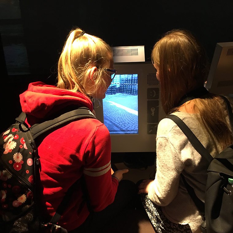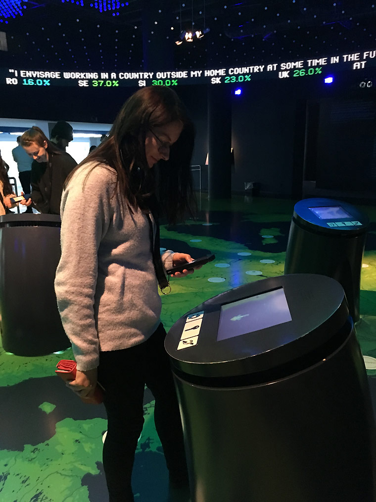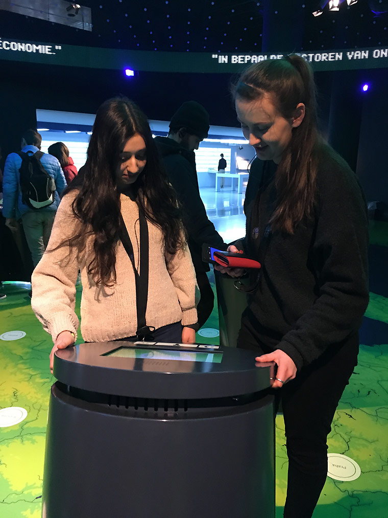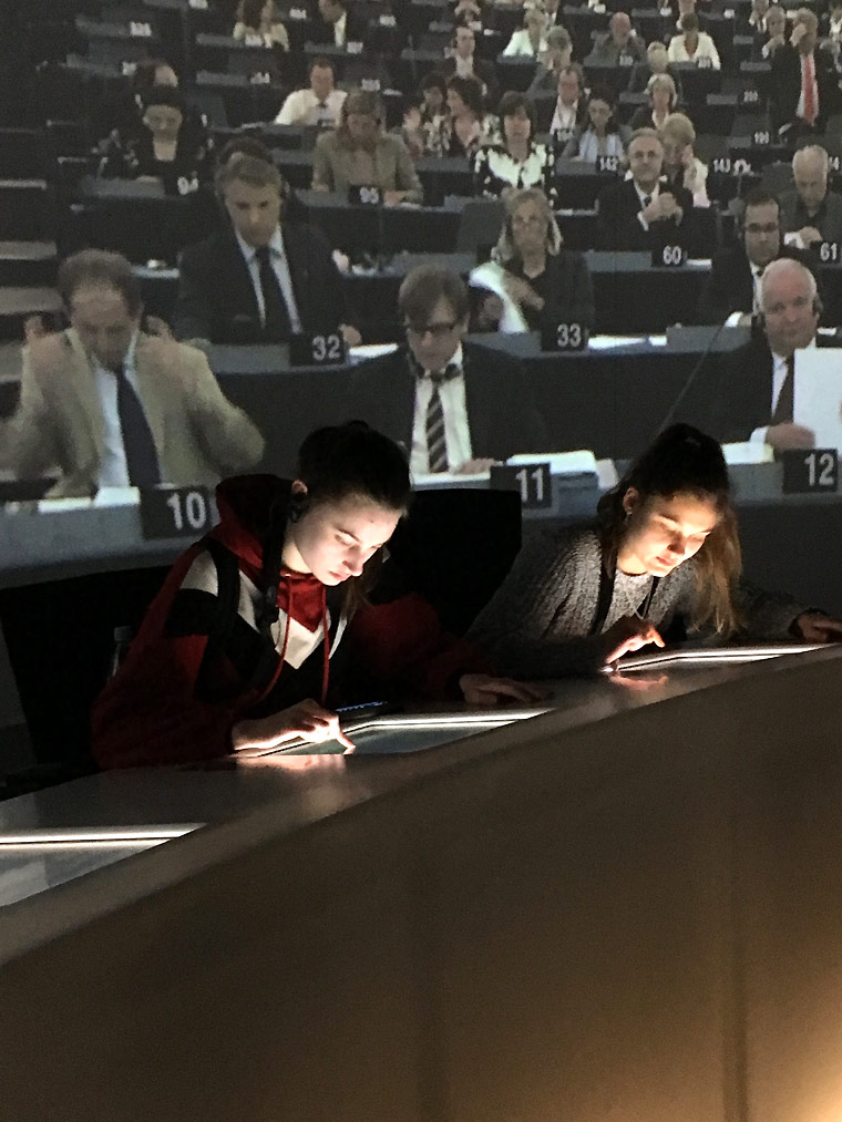 Um den Besuch des Europäischen Parlaments abzurunden, fanden wir uns im Anschluss an das Gespräch im gegenüberliegenden Besucherzentrum, dem Parlamentarium, ein. Das Parlamentarium ist ein dynamisch und interaktiv angelegtes Museum. Hier erhielten die Schülerinnen und Schüler noch einmal die Möglichkeit, ihr bereits erworbenes Wissen über die EU zu vertiefen. So konnten sie sich etwa auf einer riesigen Landkarte durch Europa bewegen und erfahren, wie sich die Europäische Union auf die einzelnen Mitgliedsstaaten auswirkt oder in einem 360°-Kino in die Arbeitsweise der Parlamentarier eintauchen. Auf einer interaktiven digitalen Leinwand konnten die Schülerinnen und Schüler abschließend ihre Gedanken zu Europa festhalten.