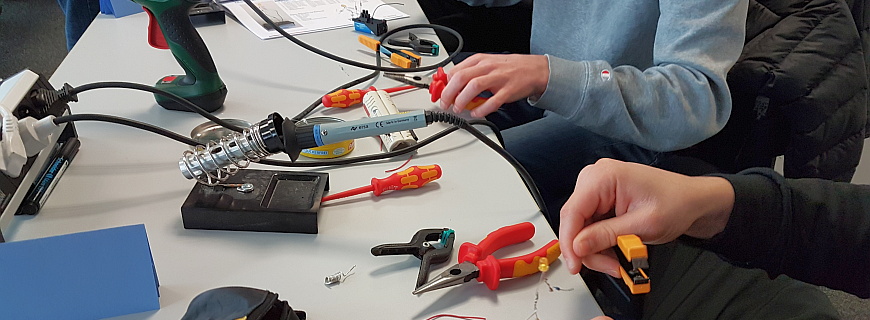 Gerade die Führung durch das Firmengebäude war besonders interessant für die einzelnen Schülerinnen und Schüler. Hier wurden ihnen die Möglichkeiten von Smart Home und Möglichkeiten der Brandschutz-Überwachung aufgezeigt. Nach einer kurzen Pause ging es dann an das praktische Arbeiten. Die Jugendlichen mussten eigene Schaltungen bauen und ein Männchen aus Drähten zusammenlöten, was auch allen gelang.