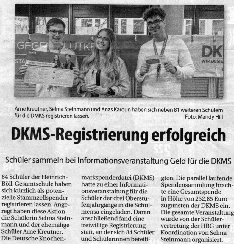 So hieß das Motto, unter dem der 24. Januar 2020 stand. Selma Steinmann hatte im Namen der SV zur Stammzellspende in die Mensa der Heinrich-Böll-Gesamtschule aufgerufen. Unser ehemaliger Schüler Arne Kreutner hatte beispielhaft 2016 diese überlebenswichtige Aktion erstmals bei uns durchgeführt. Mit seiner Unterstützung plante und organisierte nun Selma unsere diesjährige Aktion zusammen mit der DKMS (Deutsche Knochenmarksspende).