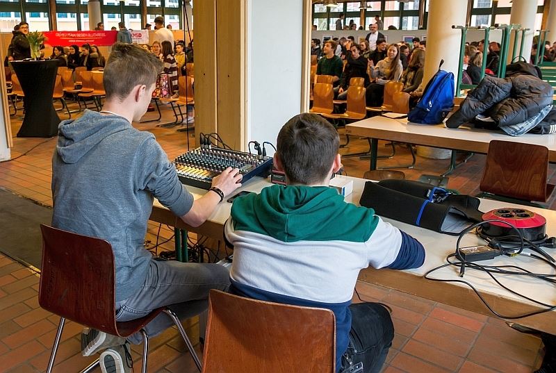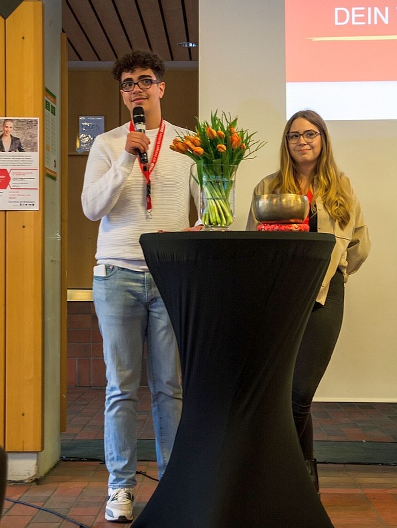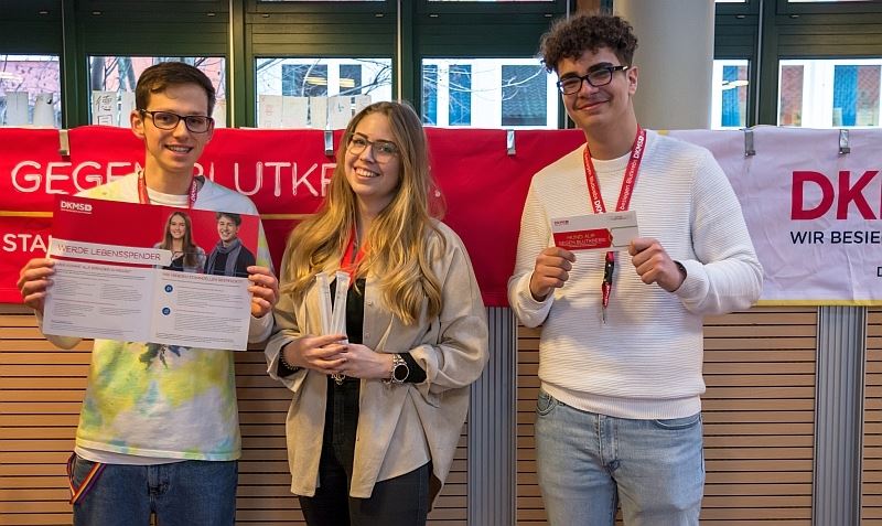 Unser Schülersprecher Anas Karoun und Selma Steinmann begrüßten am Freitagmittag eine prall gefüllte Mensa. Herr Reichstein unterstützte als Schulleiter ebenfalls diese SV-Aktion, mit gutem Beispiel vorangehend ließ er sich ebenfalls als Stammzellspender registrieren.